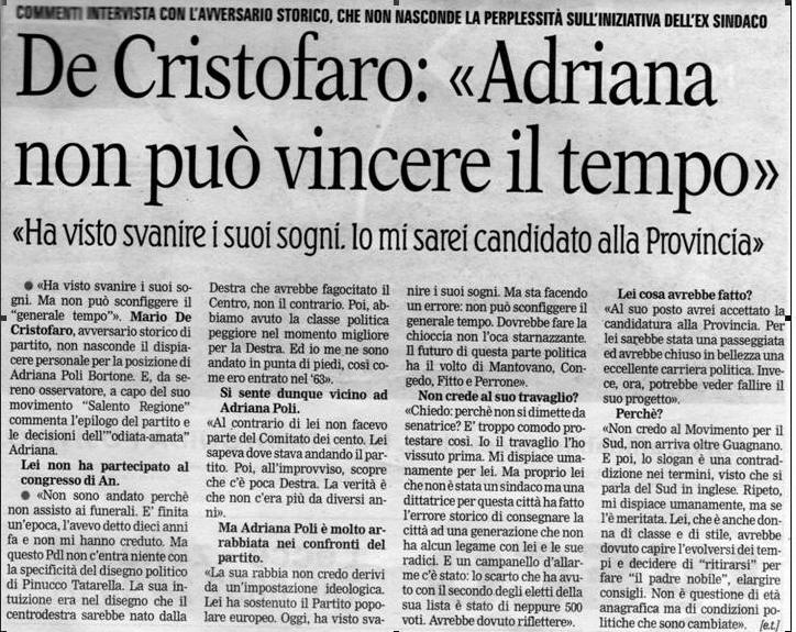 IV Congresso Provinciale An Quattordici i delegati al congresso nazionale di An del 21 e 22 marzo e a quello nazionale unitario con Forza Italia del 27. Si tratta di Paolo Alemanno, Mario Camboa, Francesco Cimino, Giancarlo Erroi,Fabio Campobasso,Franca Giannotti, GiuseppeGreco, Rosario Manca, Francesco Cantoro, Pierantonio De Matteis, Anna Laura Martella, Francesco Zuccaro, Fernando Liquori e Giuseppe Viva. Questo sta a dimostrare che il Pdl, quello ufficiale, quello vero, sta solo adesso, muovendo i primi passi verso una costruzione compiuta, individuando persone e incarichi da impartire, strutturandosi cosi come un vero partito sul territorio. Per cui le manifestazioni di primogenitura da parte di qualcuno, rispetto al Pdl erano e rimangono solo folklore. Trovo interessante inoltre pubblicare l’intervista resa da Mario De Cristofaro per “La Gazzetta del Mezzogiorno” sulla vicenda “Poli”, che peraltro condivido in pieno.